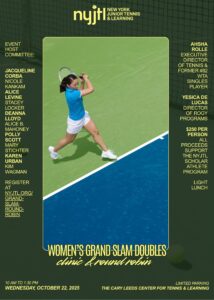 The Women’s Grand Slam Doubles will return on Wednesday, October 22, 2025! The event host committee welcomes participants for two hours of tennis and drills led by former WTA standout Ahsha Rolle and Director of ROGY Programs Yesica de Lucas, followed by a light lunch on our patio. The entire event will be held outdoors at our flagship facility at the Cary Leeds Center in the Bronx. Players of all levels join us for a great day in support of the Scholar Athlete Program of NYJTL. If you have any questions, please contact Sachi Kurup at skurup@nyjtl.org.